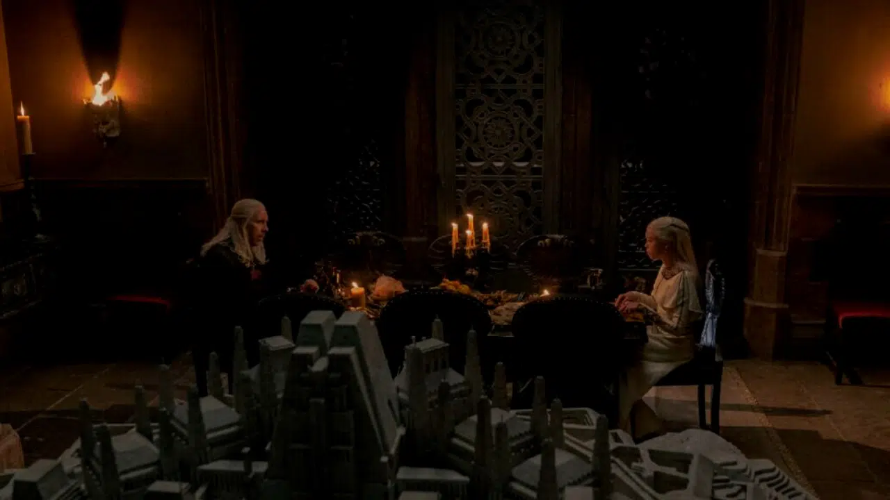 De là, nous passons au dernier sigil de la vidéo, qui porte l’image du collier en acier valyrien que Rhaenyra Targaryen s’est vu offrir par son oncle Daemon dans le premier épisode de la série. Lorsque le sang de Viserys et d’Aemma s’écoule dans le sigle de Rhaenyra, il déborde, la caméra passe sous une porte ornée d’un dragon en relief, et nous obtenons un gros zoom arrière sur le complexe urbain dans lequel le sang a coulé. Surprise, il s’agit de la maquette de l’ancienne Valyria du roi Viserys, qui montre comment le sang de l’ancien fief coule depuis Aegon jusqu’à sa descendante Rhaenyra.